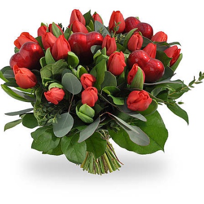 Omschrijving Boeket met gemengde rode en oranje tulpen